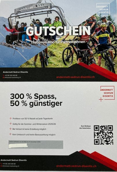 - Gutschein für Halbpreis-Abo im Skigebiet Andermatt+Sedrun+Disentis